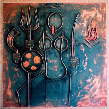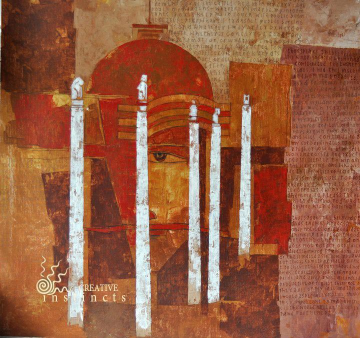 INSEPERABLY INTERWOVEN INTO MYTH-1 first painting on galvenized iron sheet( mixed media), 03-2013, 36_ x 24_